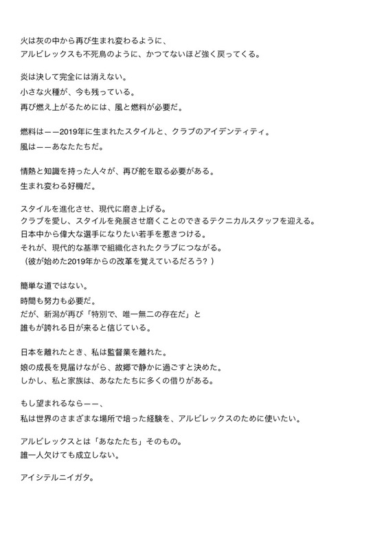 J2降格が決まったアルビレックス新潟に元監督のアルベル氏がメッセージ 「もし望まれるなら、私の経験をアルビレックスのために使いたい」