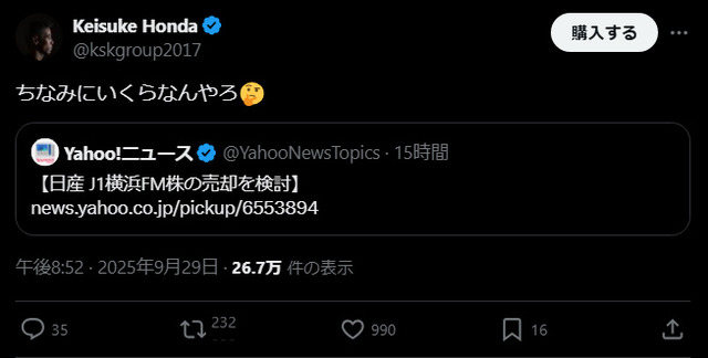 ◆アース出身◆レジェンド本田圭佑が横浜Fマリノス買収に興味!「ちなみにいくらなんやろ