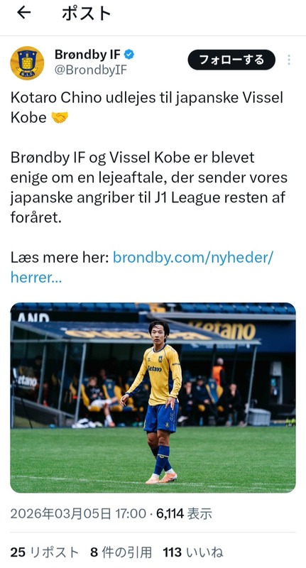 ◆悲報◆ブレンビーIFから神戸加入の内野航太郎さん、ブレンビー公式にChinoと記載されてしまう