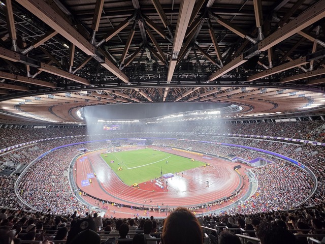 世界陸上開催中の国立競技場 雨の降る様子がなんだか神々しい