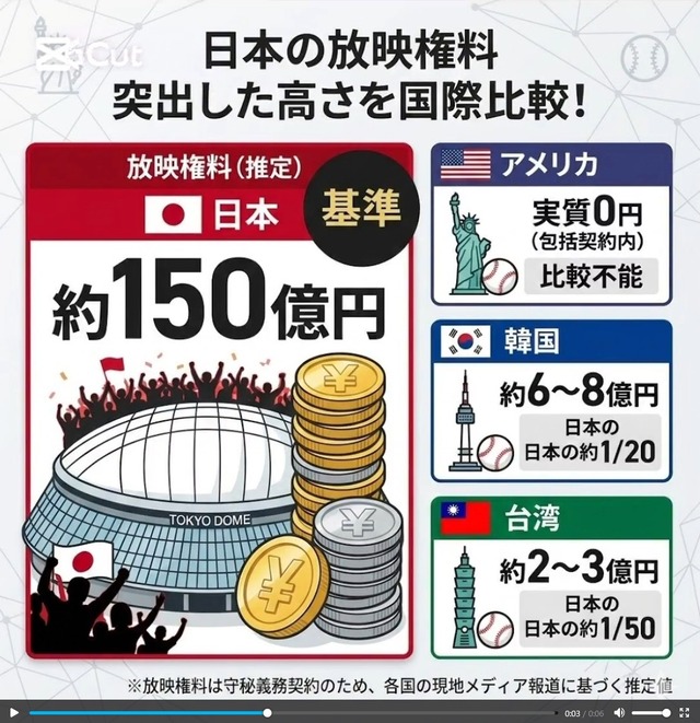 ◆悲報◆WBCの放映権料…1位日本150億円・2位韓国6-8億円・3位台湾2-3億円・最下位アメリカ実質タダ!MLBへの実質上納システム…野球植民地日本